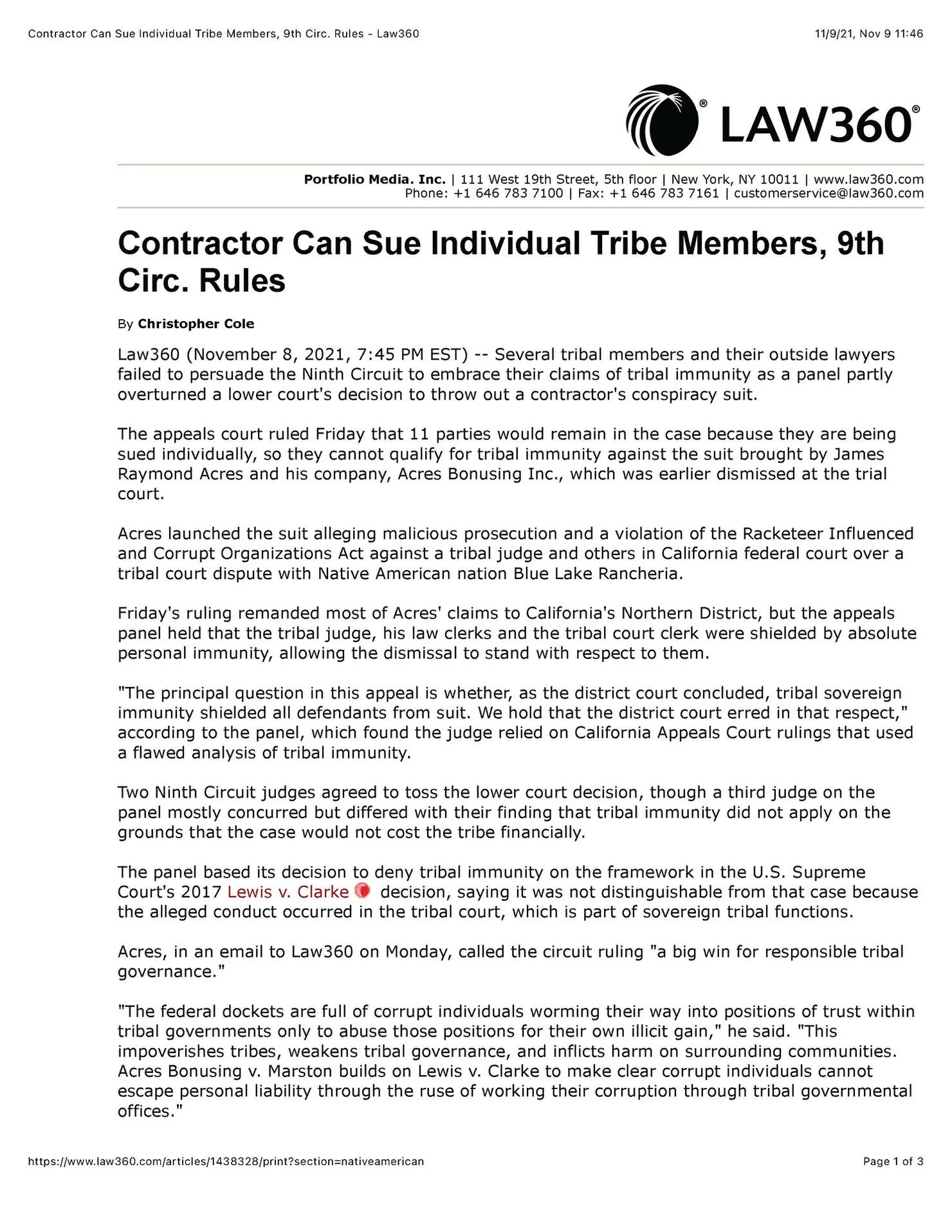 Contractor Can Sue Individual Tribe Members, 9th Circ. Rules Nov 10 Written By Ellery Sterling Ellery Sterling
